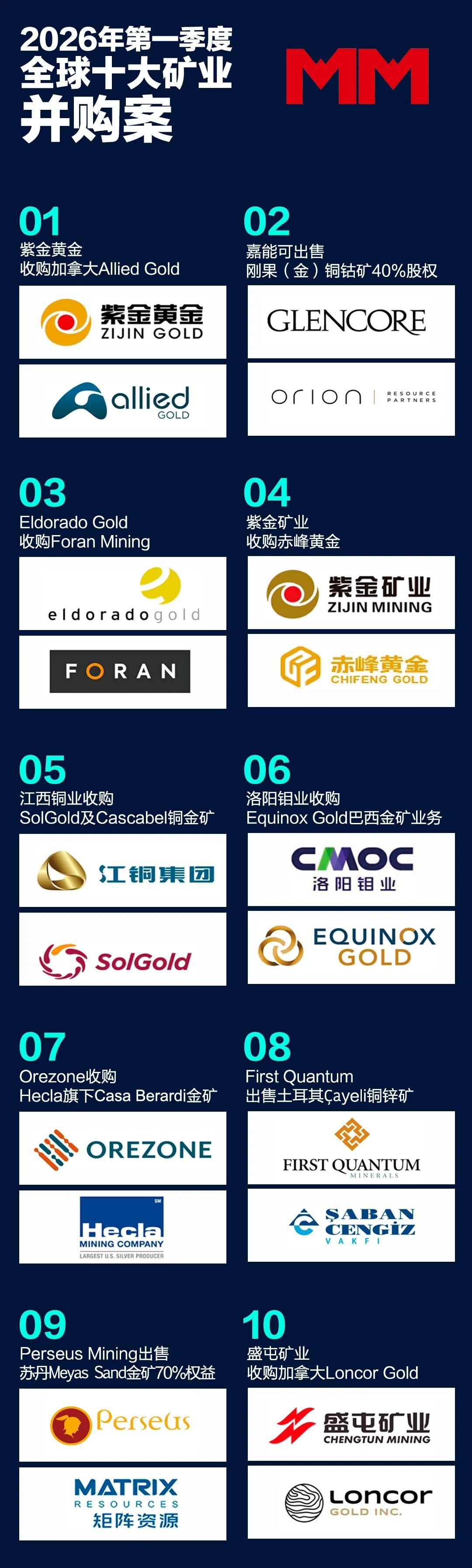 2026年第一季度,全球十大重大矿业并购案呈现中国资本绝对主导格局。紫金矿业、江西铜业、洛阳钼业、盛屯矿业、浙江力勤资源合计参与6宗核心交易,目标高度聚焦黄金与铜,既紧扣全球能源转型刚需,更彰显中国在战略矿产领域的全球化布局力度。与此同时,第一量子、Hecla、Perseus、嘉能可等西方矿企密集出售资产,以退出高风险区域、偿还债务、聚焦核心主业为战略方向。